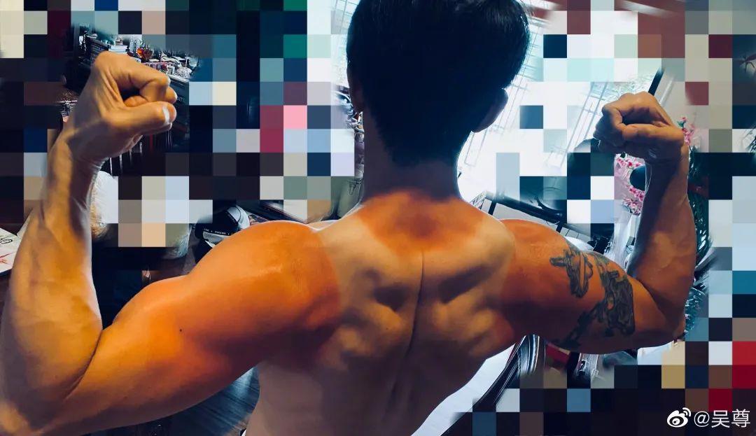 照片中,吳尊露出了上半身豐滿的肌肉線條,但是手臂被曬得又黑又紅。