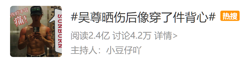 近日,#吳尊曬傷后像穿了件背心#的話題登上了熱搜,吳尊發(fā)文稱:“為了想曬更黑,固執(zhí)的不擦防曬,活該?!睂憹M了內(nèi)心的懊悔和曬傷后的痛苦。