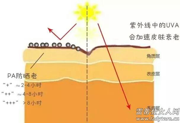 指的是防止紫外線中UVA的能力,PA+大約指防止UVA的能力2-4小時(shí),PA++大約4-8小時(shí),PA+++〉8小時(shí),現(xiàn)在防曬產(chǎn)品已有4+的,當(dāng)然大于3+的防UVA時(shí)間。寶貝們可能會(huì)問(wèn)到,UVA是一年四季都存在的,而且清晨和傍晚強(qiáng),當(dāng)小主子們下班的時(shí)候就是UVA強(qiáng)的時(shí)候,如果能在下班前補(bǔ)涂一點(diǎn)防曬產(chǎn)品,更有效防止UVA,達(dá)到延緩肌膚曬老的效果。