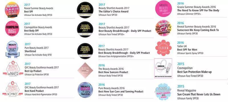 很多專家,還有很多達(dá)人都推薦過(guò)他們家的防曬產(chǎn)品,身邊也有很多人在用,還拿過(guò)很多海外獎(jiǎng)項(xiàng)呢!英國(guó)時(shí)尚 COSMO 美妝大賞、Reveal 雜志從不令人失望的防曬品等多項(xiàng)美容大獎(jiǎng)的獲得者正是 Ultrasun 優(yōu)佳。