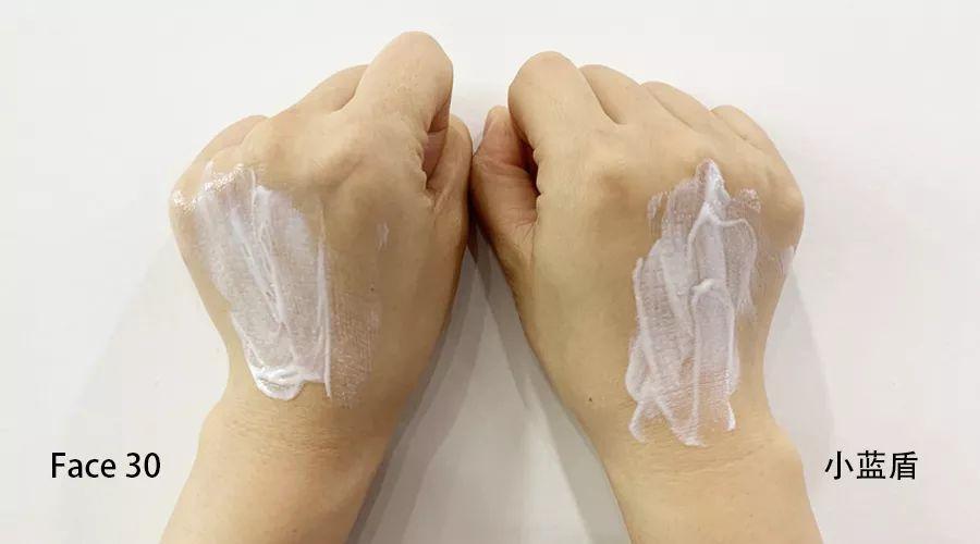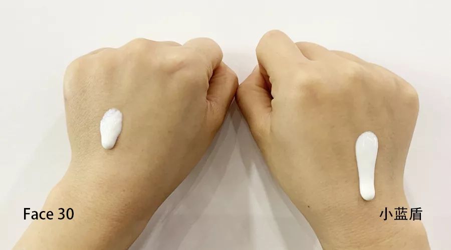 從兩款質(zhì)地對(duì)比可以看到,小藍(lán)盾的流動(dòng)性更強(qiáng),更水感, Face 30 質(zhì)地更綿厚一些。