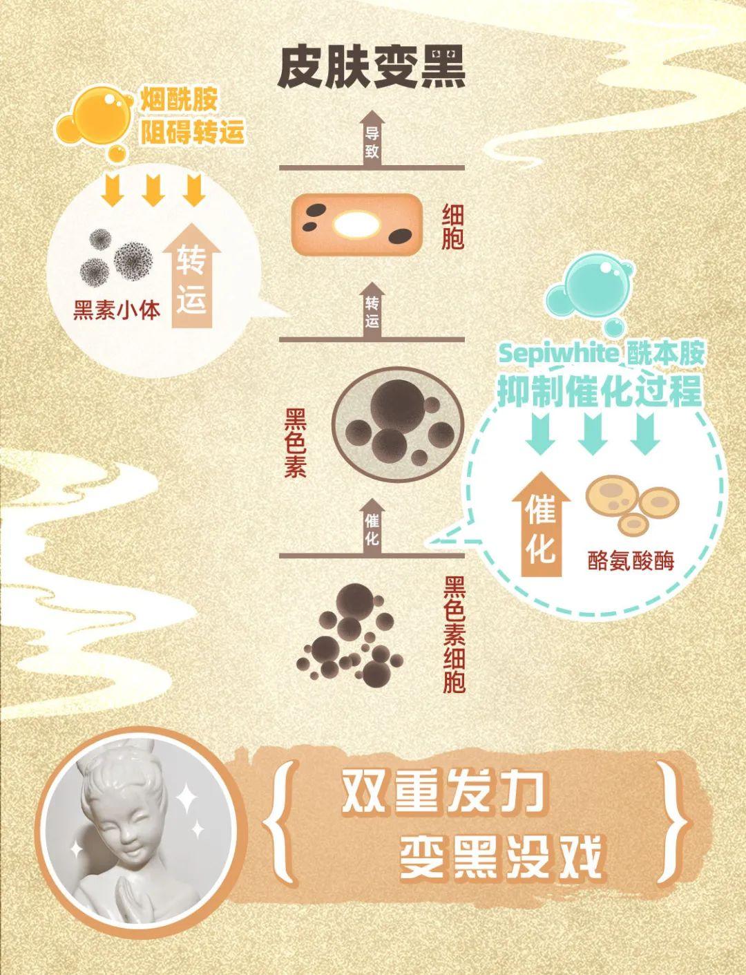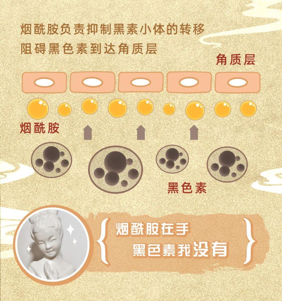 第二步:前面的工作做足之后,煙酰胺成分阻斷黑色素運輸?shù)浇琴|(zhì)層,并實現(xiàn)一定程度的抗皺效果。