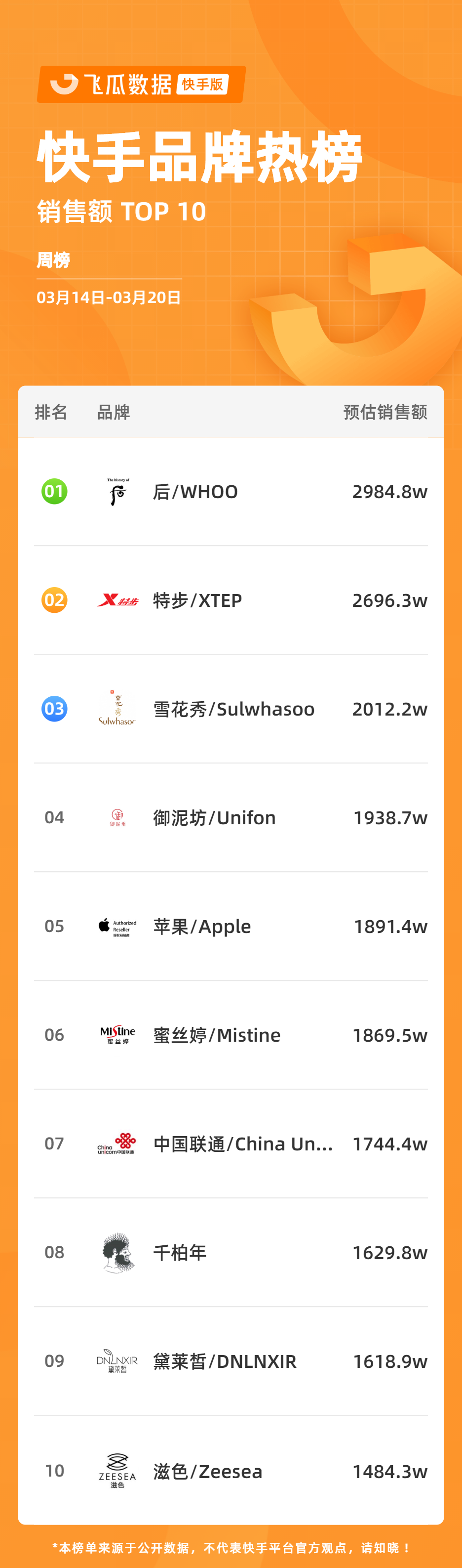 2、快手品牌周榜 TOP10飛瓜快數(shù)統(tǒng)計(jì)了2022年3月14日-3月20日的快手品牌榜:后/WHOO、特步、雪花秀 位列榜單前三名。