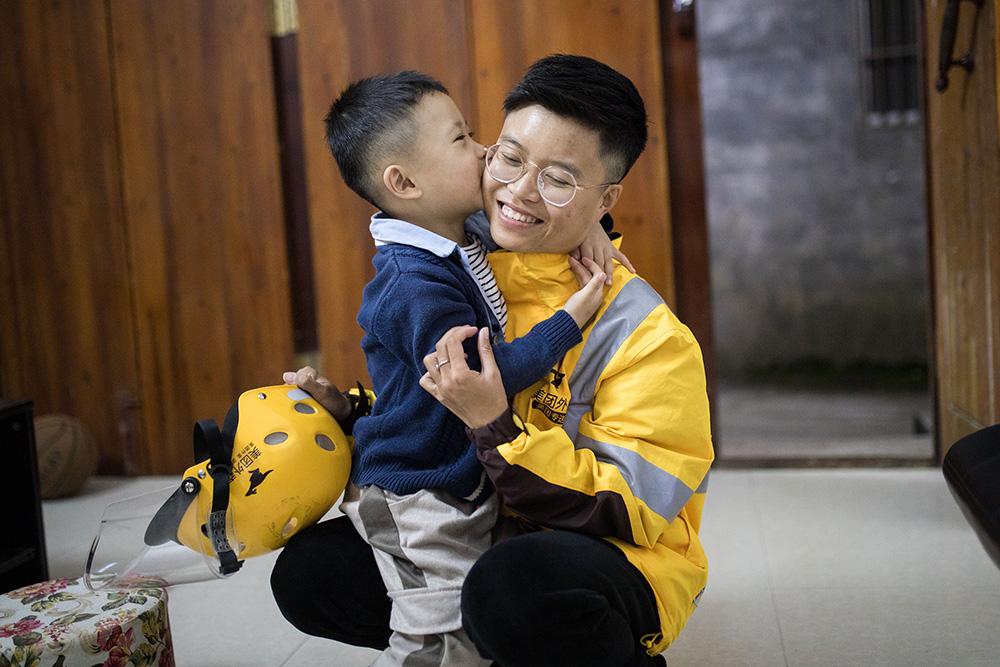 2020年10月28日,廣西靖西,一名外賣女騎手回到家中,兒子沖上前親吻了媽媽的臉頰。許康平/視覺中國 資料圖
