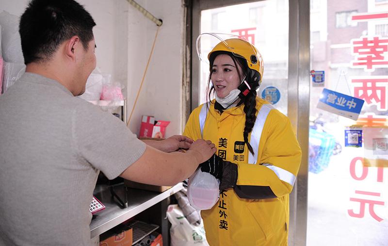 2017年4月10日,浙江省杭州市,1994年出生的一名女騎手,正在將外賣送至顧客手中。視覺中國 資料圖