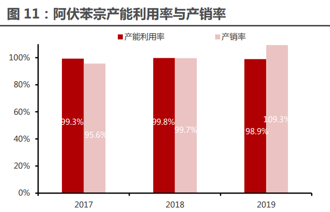 阿伏苯宗疫情前產(chǎn)能已趨飽和。作為公司主要產(chǎn)品,阿伏苯宗近三年銷量不斷攀升,2019 年阿伏苯宗銷售收入達(dá) 1.88 億元,同比增長(zhǎng) 19.34%,占主營(yíng)業(yè)務(wù)收入近 17%。但疫情前阿伏 苯宗產(chǎn)能利用率和產(chǎn)銷率持續(xù)保持在近 的較高水平,生產(chǎn)能力已達(dá)瓶頸。