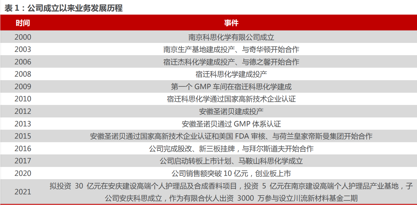 客戶+產(chǎn)品+產(chǎn)能螺旋式向上,進(jìn)入多元化發(fā)展時(shí)期??扑脊煞輨?chuàng)立于 2000 年 4 月,自成 立二十余年來(lái),公司始終堅(jiān)持以科技創(chuàng)新和品質(zhì)管理驅(qū)動(dòng)企業(yè)發(fā)展,主要從事日用化學(xué)品原料的 研發(fā)、生產(chǎn)和銷售,產(chǎn)品涵蓋防曬劑等化妝品活性成分、合成香料等。經(jīng)過(guò)長(zhǎng)期自主開發(fā)和積累, 形成了從實(shí)驗(yàn)室到工業(yè)化生產(chǎn)的研發(fā)和轉(zhuǎn)化體系,擁有省級(jí)企業(yè)技術(shù)中心及多項(xiàng)技術(shù)成果和高新 技術(shù)產(chǎn)品認(rèn)定,產(chǎn)品也在國(guó)際市場(chǎng)上具有較強(qiáng)的競(jìng)爭(zhēng)力。截至 2019 年公司以銷量計(jì)防曬劑 市占率超 28%。2017 年,公司啟動(dòng)轉(zhuǎn)板計(jì)劃并于 2020 年完成了創(chuàng)業(yè)板上市工作。上市后啟動(dòng) 募投項(xiàng)目,另外,2021 年公司啟動(dòng)建設(shè)高端個(gè)人護(hù)理品及合成香料等項(xiàng)目,為長(zhǎng)期發(fā)展提供長(zhǎng) 足動(dòng)力。