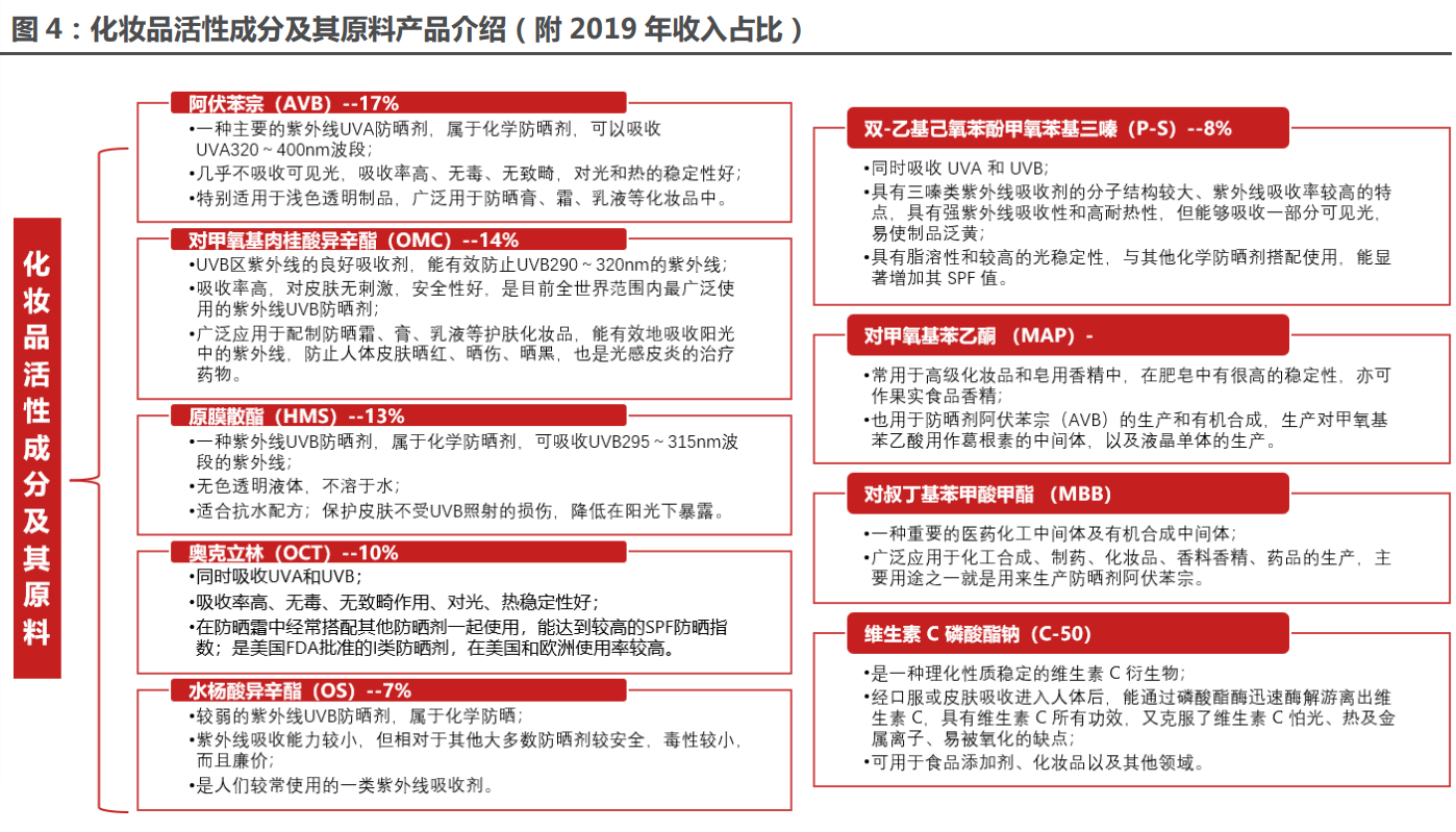 防曬劑產(chǎn)品矩陣豐富?;瘖y品活性成分及其原料主要為防曬化妝品中的防曬劑及其原料,廣 泛用于防曬膏、霜、乳液等化妝品、紫外線吸收劑中,公司是主要的化學(xué)防曬劑制造商之 一,據(jù) Euromonitor,公司防曬劑市占率(以銷量計(jì))從 2017 年的 21%提升至 2019 年 的 28%,也是國(guó)內(nèi)少數(shù)通過(guò)美國(guó) FDA 審核和歐盟化妝品原料規(guī)范(EFfCI)認(rèn)證的日用化學(xué)品原 料制造商。產(chǎn)品配套齊全,具備同時(shí)生產(chǎn)多種防曬劑系列產(chǎn)品的能力,覆蓋目前市場(chǎng)上主要化學(xué) 防曬劑品類,且涵蓋了 UVA、UVB 的所有波段,主要包括阿伏苯宗(AVB)、奧克立林(OCT)、對(duì) 甲氧基肉桂酸異辛酯(OMC)、原膜散酯(HMS)、水楊酸異辛酯(OS)、雙-乙基己氧苯酚甲氧苯基 三嗪(P-S)、辛基三嗪酮(EHT)等。
