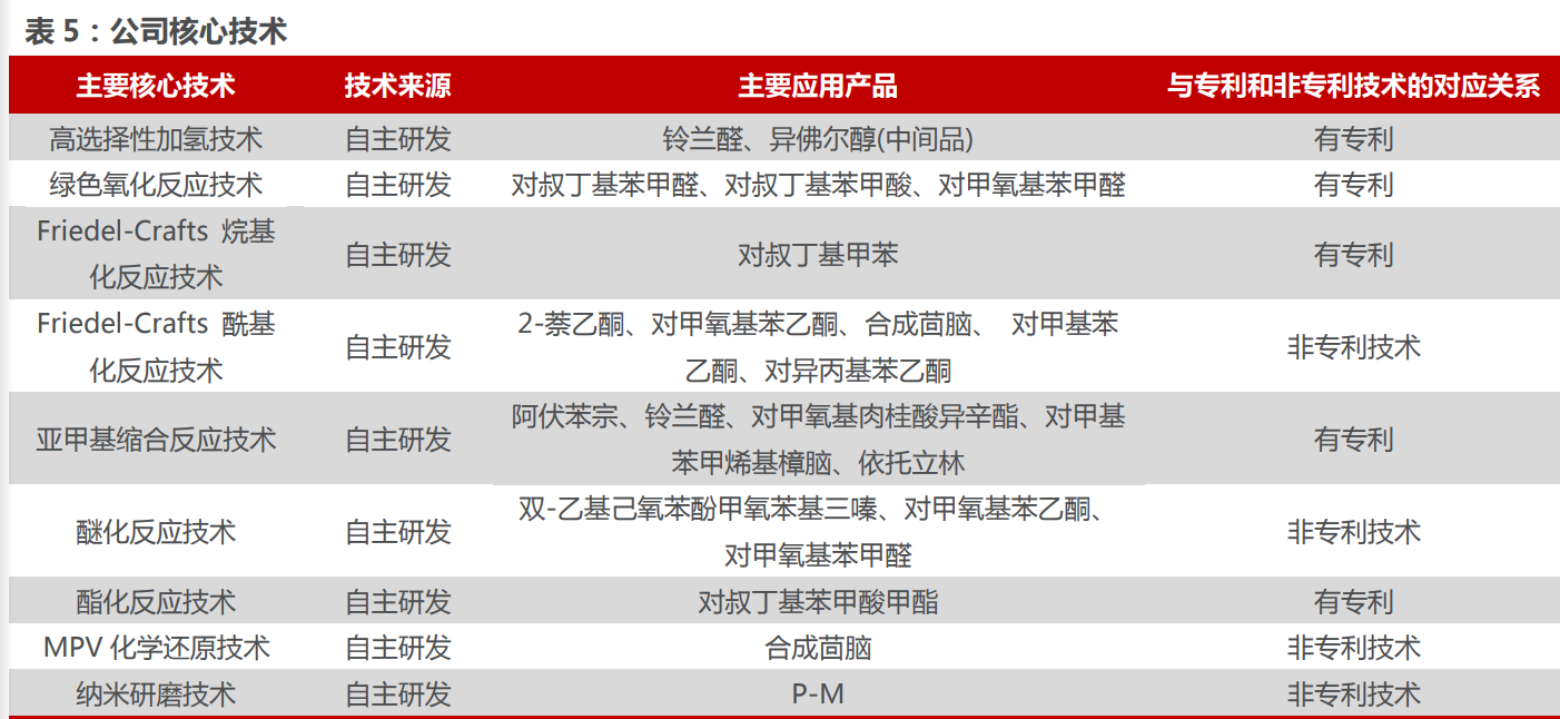 核心技術(shù)持續(xù)研發(fā)助力產(chǎn)品矩陣拓寬。已經(jīng)形成了自己的核心技術(shù)和特色生產(chǎn)工藝,如高選 擇性加氫技術(shù)、綠色氧化反應(yīng)技術(shù)等。目前,公司已掌握 9 種核心的合成技術(shù)與工藝,其中大多 為自主研發(fā)并擁有相關(guān)對(duì)應(yīng)專利。截至 2020 年末,已形成了 130 余項(xiàng)專利技術(shù)(含 22 項(xiàng)產(chǎn)品 發(fā)明專利),涵蓋公司大部分產(chǎn)品如對(duì)甲氧基苯甲醛、鈴蘭醛、阿伏苯宗、原膜散酯等的制備工 藝和生產(chǎn)設(shè)備,提升企業(yè)的核心競(jìng)爭(zhēng)力。