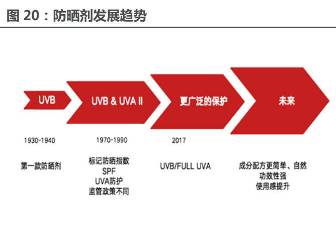 防曬從關(guān)注 UVB 向全波段轉(zhuǎn)變。紫外線分為 UVA 和 UVB 兩類,其中 UVB 作用于皮膚表 面,通常表現(xiàn)為具有即時(shí)性的曬黑曬傷,UVA 一年四季強(qiáng)度幾乎相同,且可在陰天穿透云層,較 UVB 更具隱蔽性和持續(xù)性。以前人們更重視對(duì) UVB 的防護(hù),近年隨著防曬知識(shí)的普及和防曬意 識(shí)的提高,對(duì) UVA 乃至全波段防護(hù)效果更好的新型化學(xué)防曬產(chǎn)品需求爆發(fā),傳導(dǎo)至上游防曬原 材料,利好阿伏苯宗、奧克立林、二苯酮、水楊酸乙基己酯、P-S 等化學(xué)防曬原料。(報(bào)告來(lái)源:未來(lái)智庫(kù))