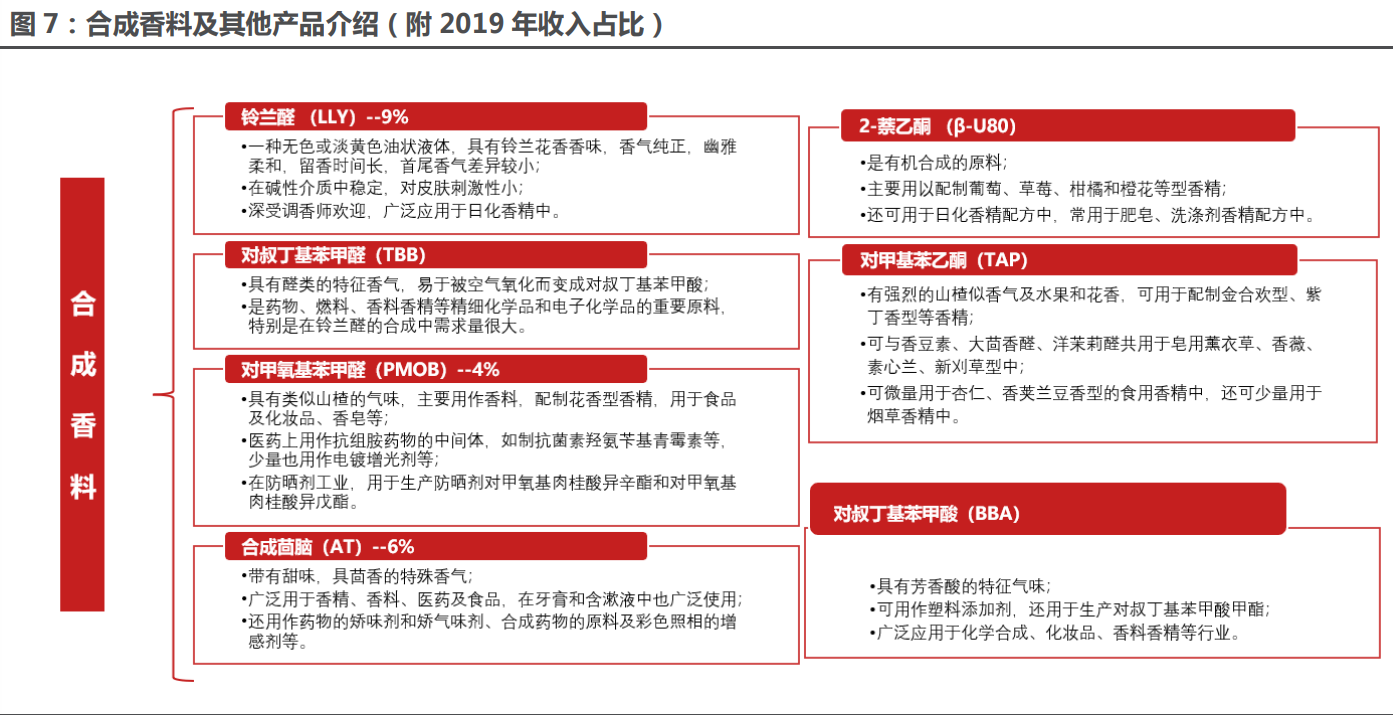 合成香料是通過(guò)化學(xué)合成方法生產(chǎn)的香料,主要在配制成各類香精后應(yīng)用于化妝品、洗滌用 品、口腔護(hù)理品等日化用品中。看當(dāng)下:公司從事合成香料的研發(fā)、生產(chǎn)和銷售已近 20 年,主 要產(chǎn)品包括鈴蘭醛(LLY)、合成茴腦(AT)、2-萘乙酮(β-U80)、對(duì)甲氧基苯甲醛(PMOB)、對(duì)叔丁 基苯甲醛(TBB)、對(duì)甲基苯乙酮(TAP)等。特別是鈴蘭醛產(chǎn)品,目前能夠進(jìn)行大規(guī)模生產(chǎn)的制造商僅有巴斯夫、克拉瑪(Emerald Kalama)和科思股份三家??次磥?lái):根據(jù)公司公告,在合 成香料方面,公司將開展吐納麝香、覆盆子酮、新鈴蘭醇、牛奶內(nèi)酯、白花醇、香芹酮等產(chǎn)品的 工藝開發(fā)。