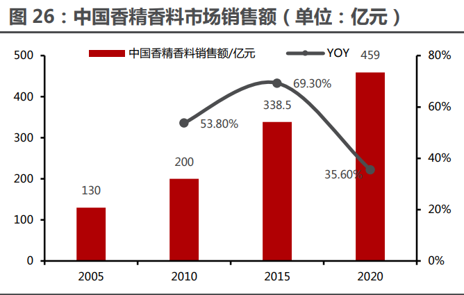 下游產(chǎn)業(yè)蓬勃發(fā)展推動(dòng)香精香料需求,國(guó)內(nèi)市場(chǎng)異軍突起。隨著經(jīng)濟(jì)發(fā)展,食品、日化、 制藥等產(chǎn)業(yè)在范圍內(nèi)都呈現(xiàn)了穩(wěn)定的增長(zhǎng),2012-2015 年,香料香精市場(chǎng)增長(zhǎng)態(tài)勢(shì)較 低迷,2016 年開始回暖,2011 年-2017 年的年復(fù)合增長(zhǎng)率約 3.18%,2020 年香精香料市 場(chǎng)規(guī)模達(dá) 1805 億元。其中,國(guó)內(nèi)增長(zhǎng)更快,2005-2020 年,我國(guó)香精香料行業(yè)由 2005 年的 130 億元迅速增至 2020 年的 459 億元,CAGR 高達(dá) 8.8%。