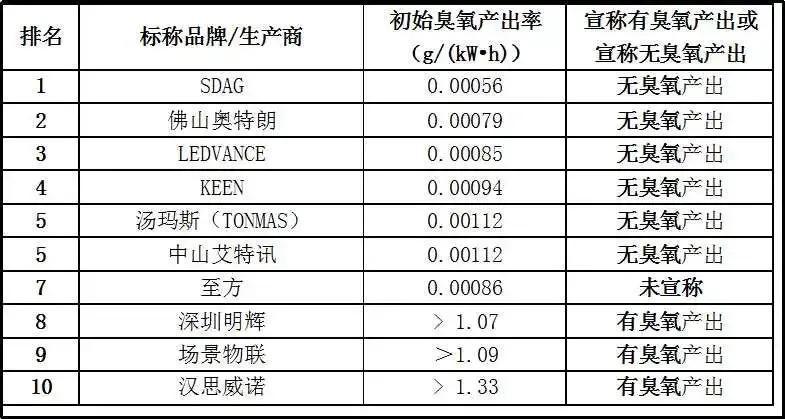11款宣稱無臭氧燈的樣品和1款未宣稱的樣品,實測初始臭氧產(chǎn)出率均遠低于標準限值要求0.05g/(kW·h),表現(xiàn)較佳。