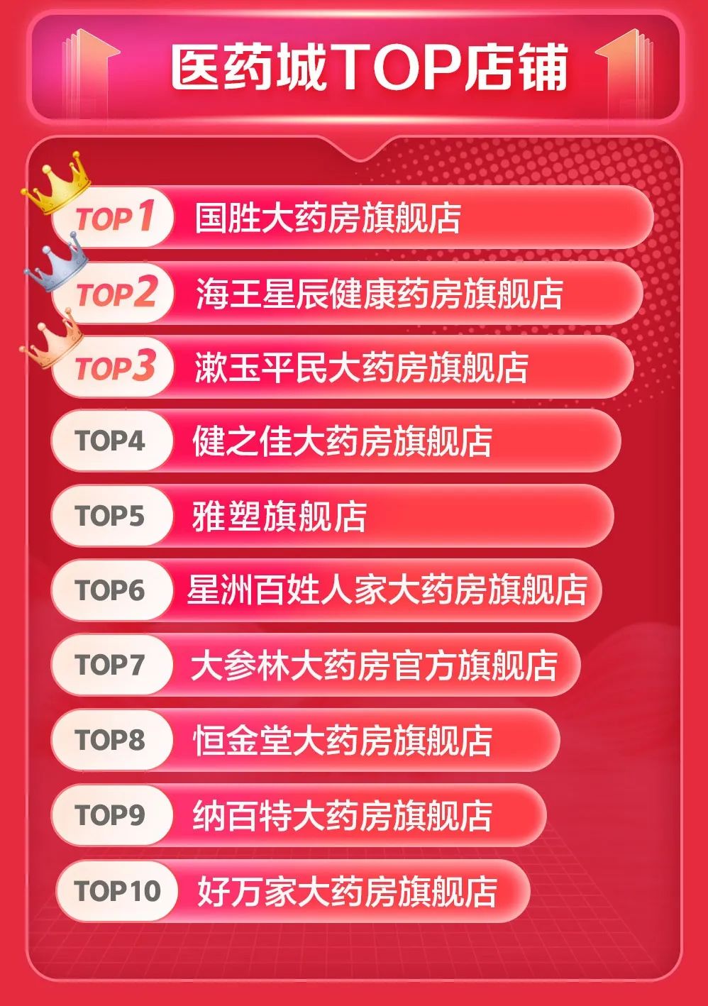 醫(yī)藥城TOP10店鋪排行榜中,國勝大藥房旗艦店奪得第一,海王星辰健康藥房旗艦店、漱玉平民大藥房旗艦店位列第二、第三。此外,健之佳大藥房旗艦店、雅塑旗艦店、星洲百姓人家大藥房旗艦店、大參林大藥房官方旗艦店、恒金堂大藥房旗艦店、納百特大藥房旗艦店、好萬家大藥房旗艦店等也上榜。