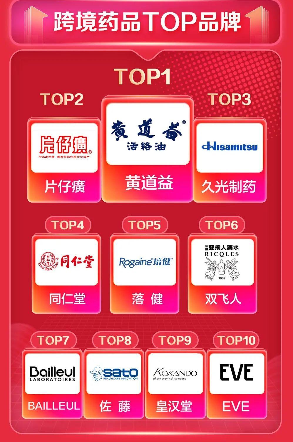 跨境藥品TOP品牌榜中,黃道益、片仔癀、久光制藥奪下前三名,同仁堂、落健、雙飛人、BAILLEUL、佐藤、皇漢堂、EVE等也位列top10。