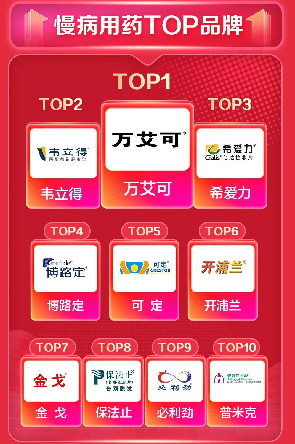 在慢病用藥領(lǐng)域,萬艾可、韋立得、希愛力依然“霸榜”前三名,博路定、可定、開浦蘭、金戈、保法止、必利勁、普米克上榜。