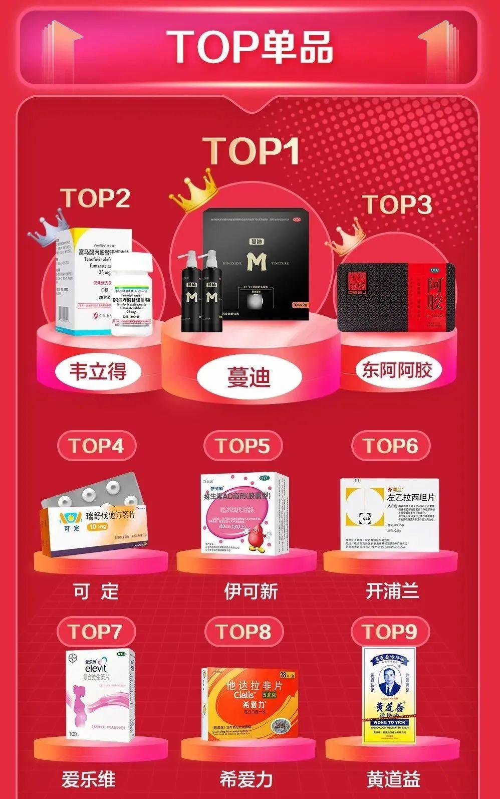 蔓迪斬獲京東健康TOP單品的,韋立得、東阿阿膠位列第二、第三。此外,可定、伊可新、開浦蘭、愛樂維、希愛力、黃道益等位列TOP9。