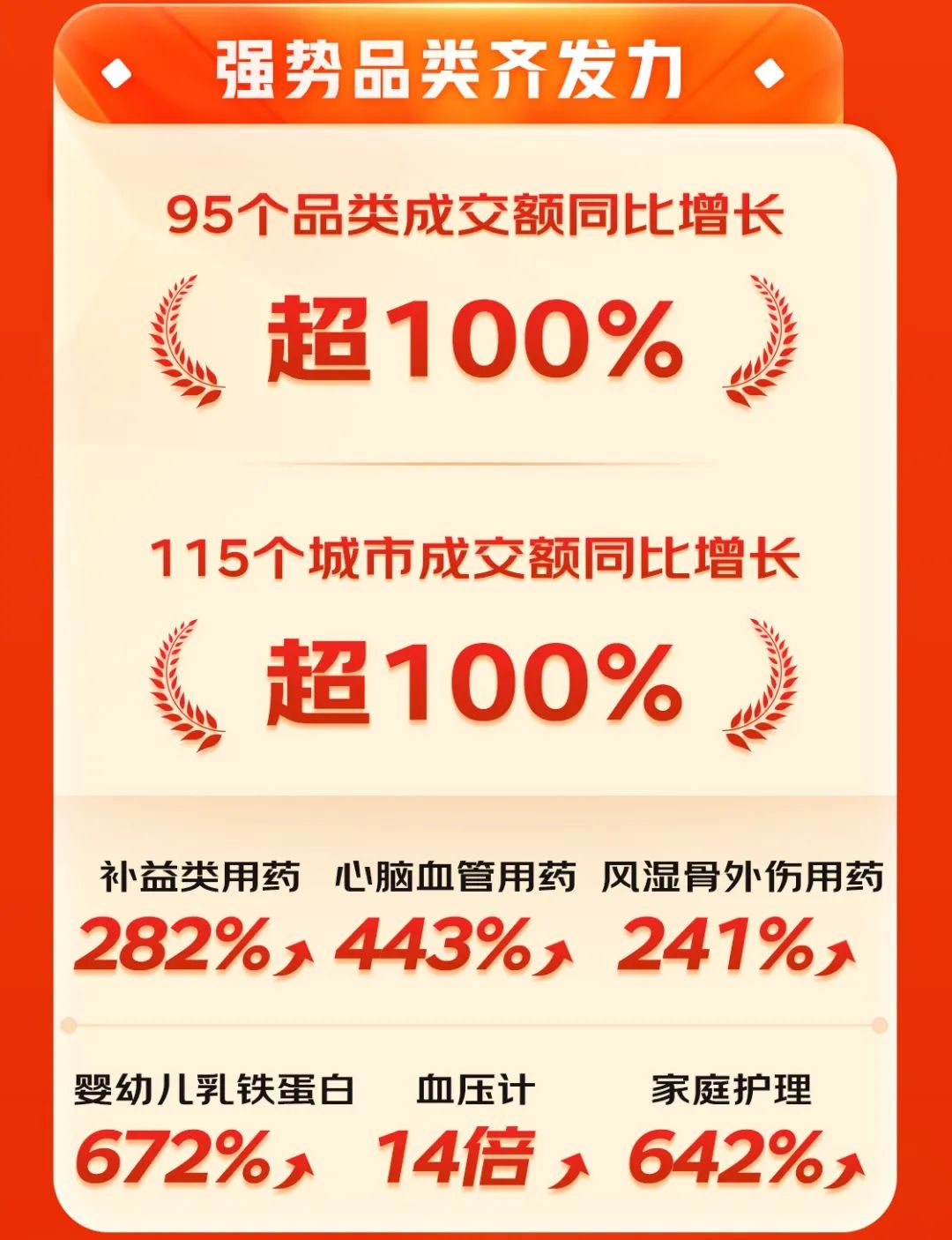 從品類來看,95個品類成交額同比增長超,115個城市成交額同比增長超。其中,補(bǔ)益類用藥同比增長282%,心腦血管用藥同比增長443%,風(fēng)濕骨外傷用藥同比增長241%,嬰幼兒乳鐵蛋白同比增長672%,血壓計同比增長14倍,家庭護(hù)理同比增長642%。