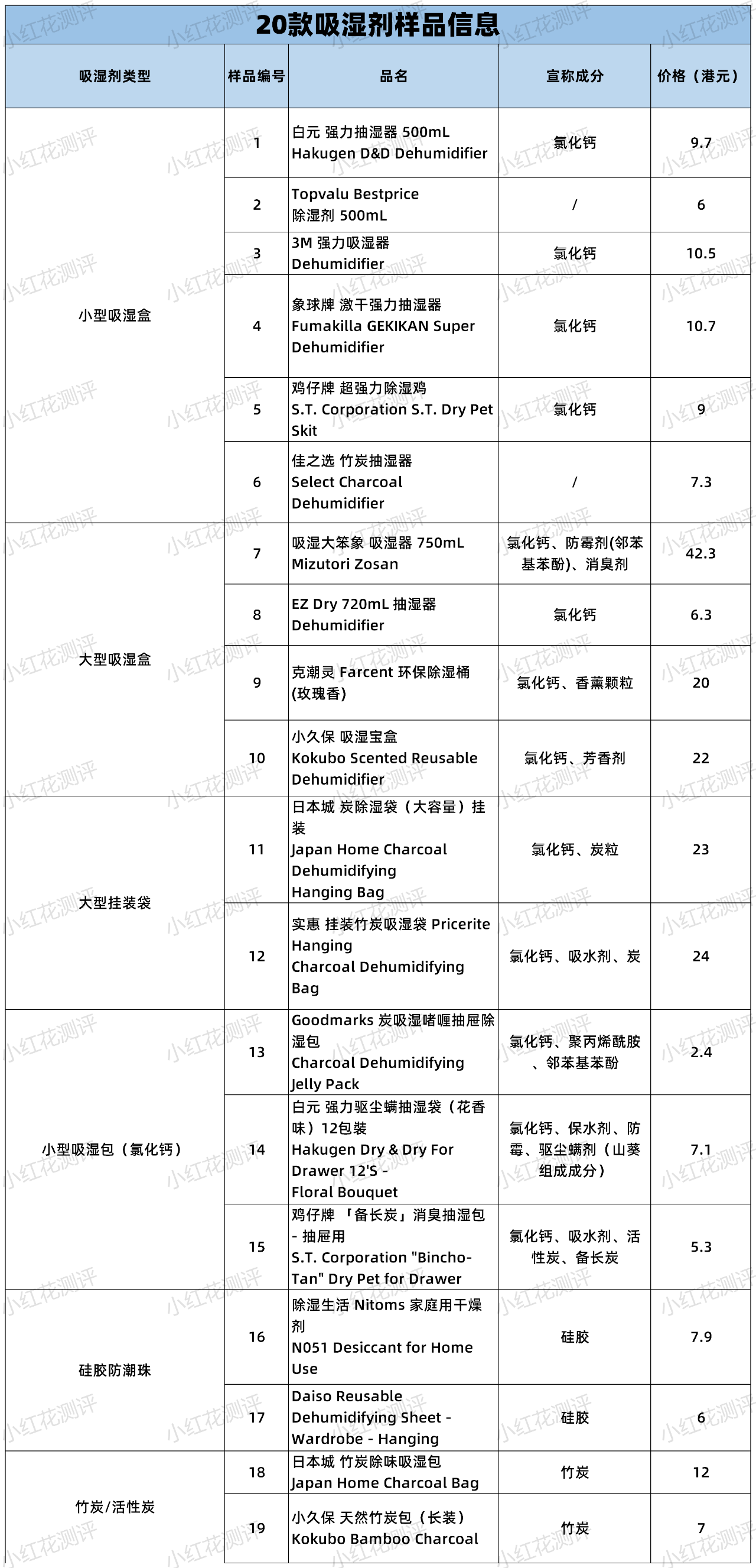 測評樣品本次吸濕劑測評樣品,涵蓋了小型吸濕盒、大型吸濕盒、大型掛裝帶、小型吸濕包(氯化鈣)、硅膠防潮珠、竹炭/活性炭6種,吸濕成分有氯化鈣/硅膠/竹炭/活性炭。