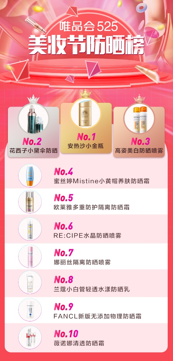 “唯品會(huì)525美妝節(jié)”防曬榜以銷售額、好評(píng)率以及站內(nèi)搜索量為評(píng)判依據(jù),對(duì)唯品會(huì)站內(nèi)多個(gè)防曬知名產(chǎn)品進(jìn)行綜合評(píng)分,終推出受歡迎的10款防曬產(chǎn)品。其中安熱沙小金瓶清透防水防曬霜搶占榜首,花西子小黛傘防曬妝前霜、高姿多效美白防曬噴霧、Mistine小黃帽隔離防曬霜、歐萊雅多重防護(hù)隔離防曬霜、RE:CIPE玥之秘水晶防曬噴霧、娜麗絲隔離防曬噴霧、蘭蔻小白管輕透水漾防曬乳、FANCL新版無添加物理防曬霜、薇諾娜清透防曬霜位列十強(qiáng)。隨著溫度的攀升,這些防曬產(chǎn)品大受消費(fèi)者歡迎。唯品會(huì)數(shù)據(jù)顯示,5月份防曬產(chǎn)品的銷售量環(huán)比上升39%。