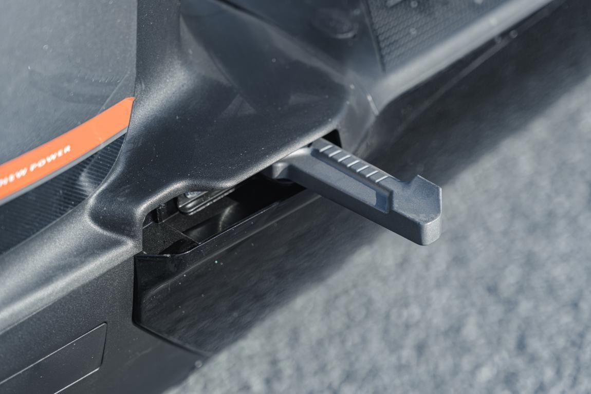 駕駛座前360mm的大檔距,腿部空間很大,放腳的踏板,角度也更舒服,在實(shí)際騎行中友好不少,特別是長(zhǎng)期駕駛,大空間能讓舒適性加倍。