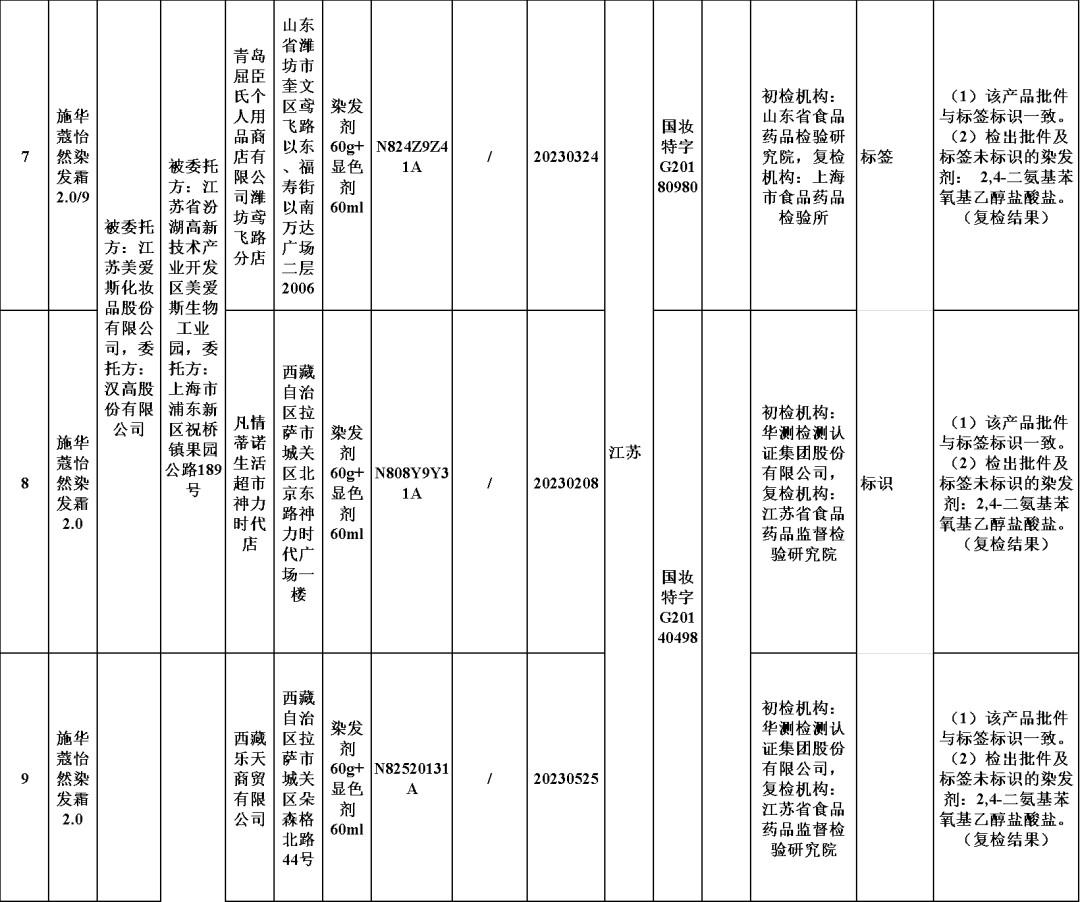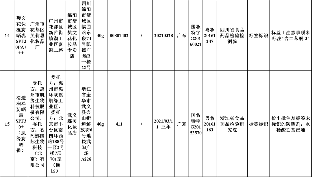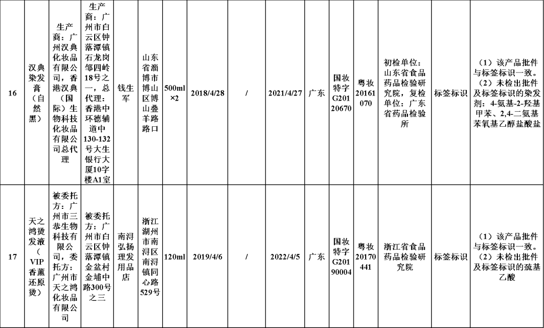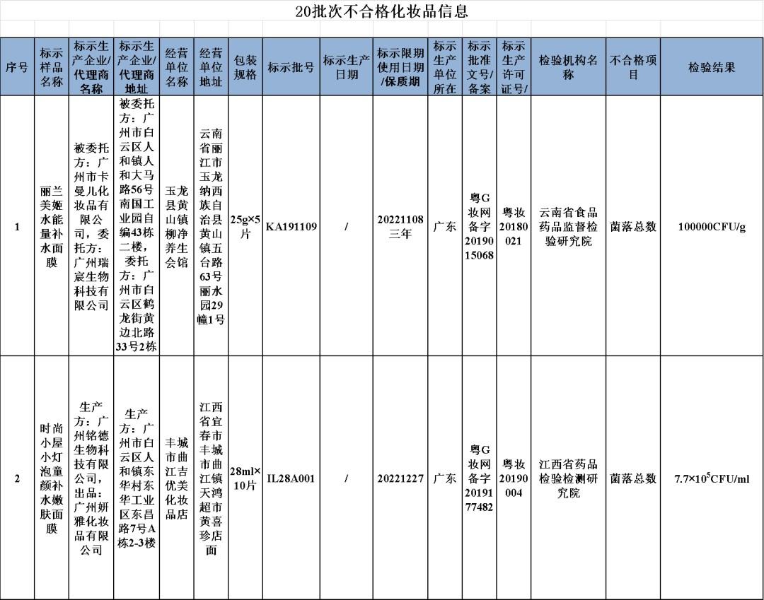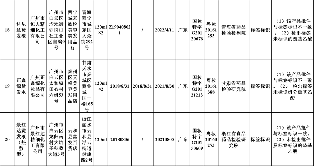 2021年1月28日,藥品監(jiān)督管理局網(wǎng)站發(fā)布的《關(guān)于20批次不合格化妝品的通告(2021年第11號)》顯示,在2020年化妝品監(jiān)督抽檢工作中,經(jīng)云南省食品藥品監(jiān)督檢驗研究院等單位檢驗,標(biāo)示為肇慶市凱捷科技有限公司等生產(chǎn)的凱捷染發(fā)膏(橙色)等10批次染發(fā)類產(chǎn)品,廣州瑞宸生物科技有限公司生產(chǎn)的麗蘭美姬水能量補水面膜等3批次面膜類產(chǎn)品,廣州市花都區(qū)芙莉思化妝品等生產(chǎn)的樊文花保濕防曬乳SPF30PA+++等2批次防曬類產(chǎn)品,廣州市天之鴻化妝品有限公司等生產(chǎn)的5批次燙發(fā)/脫毛類產(chǎn)品不合格。