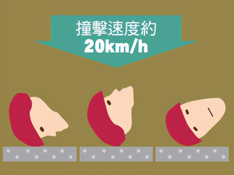 首3個(gè)撞擊以頸椎與水平線成25度角,撞向頭部的正前方、后方及側(cè)面,撞擊速度約為20km/h。