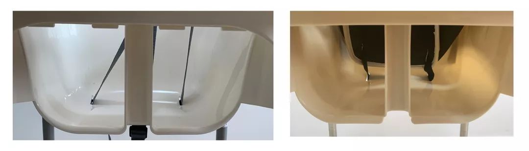 ③卡神媽咪、森美尚的靠背為拼接式設(shè)計(jì),而且沒有PU皮套保護(hù)。因此,如果靠背處灑上了湯水,可能會(huì)殘留在接縫處,不易徹底清洗。