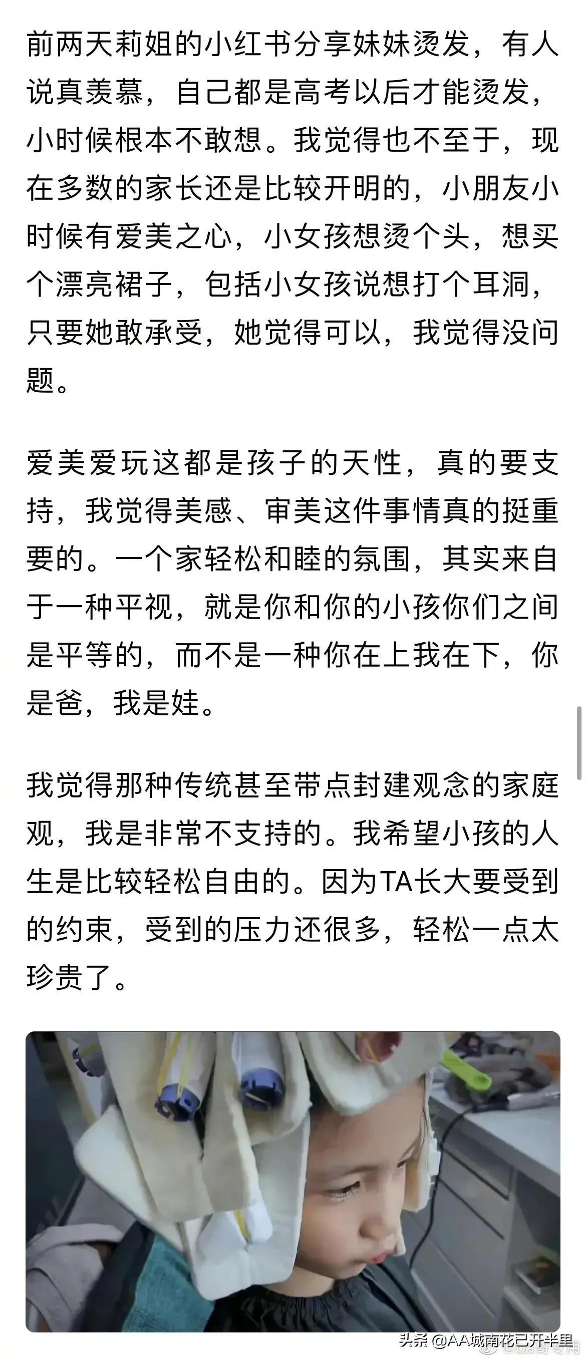 就是 我家女兒周末的時(shí)候還會(huì)偷偷涂我的口紅呢 這不都很正常嗎。黃磊也是不淡定,說那么多干嘛…真那么護(hù)犢子,就別動(dòng)不動(dòng)曬,安安靜靜過自己的小日子…因?yàn)榇蟊娖脚_(tái)就存在各種看法各種聲音…不可能都是贊美和祝福。況且置疑聲中,大部分也沒什么惡意…何必反唇相譏,說別人什么封建家庭…以前覺得他還行,現(xiàn)在覺得他也不過如此…我女兒小的時(shí)候看到別人的卷發(fā)也很喜歡,我也帶她燙過一次頭發(fā),雖然燙發(fā)對發(fā)質(zhì)有損,但又不像大人一樣隔一段時(shí)間燙一次那么頻繁,頭發(fā)又不是不長,長長了把受損頭發(fā)剪了就是了,沒必要上綱上線,大一點(diǎn)上了三四年級(jí)就不再燙了就是了。如果學(xué)校沒有要求,我女兒想要嘗試,我也會(huì)酌情考慮的。我不是啥思想開放的家長,我只是不覺得燙頭發(fā)就是壞孩子,而且在每一個(gè)好奇的階段鼓勵(lì)她去嘗試,也不一定是壞事!我女兒上幼兒園喜歡我的美甲,我會(huì)買指甲油給她抹,她很開心得到滿足后也沒說天天要擦。給她買了美甲貼紙得瑟了一個(gè)星期不準(zhǔn)我撕,也不了了之了!喜歡愛莎高跟鞋,買了一雙臭美了幾個(gè)月(只在家里和小區(qū)穿)好像也就那樣了!喜歡公主裙安排上,天氣一熱死活不穿了,自己自覺挑短袖短褲,不需要跟我扯皮幼兒園穿裙子不方便的問題。還有亮晶晶的寶石耳貼,花里胡哨的公主首飾。這些都不在我的審美,但是真的一個(gè)小小的物品就能讓孩子滿足開心,何樂而不為?我更贊同的是及時(shí)行樂,誰也不能自己就能安穩(wěn)過完一生,只要當(dāng)下孩子心存善良,樂觀積極,正直友愛,她就是個(gè)好孩子!