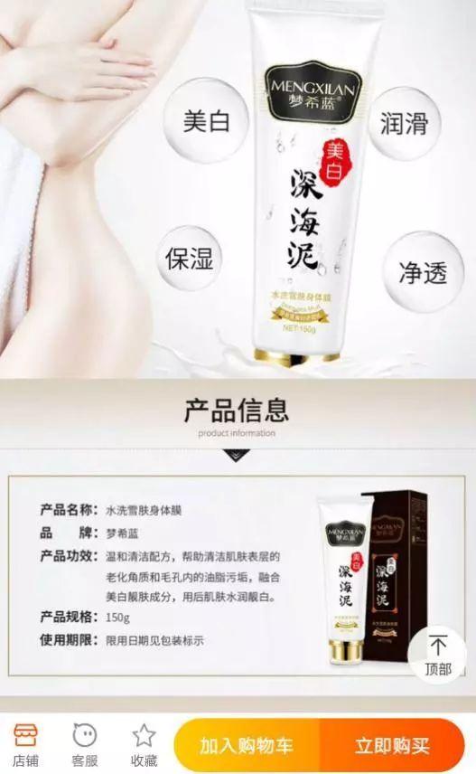 品牌為“夢希藍”的“美白潔面乳”,在店家展示的產(chǎn)品信息圖片中卻標示產(chǎn)品名稱為“水洗雪膚身體膜”。