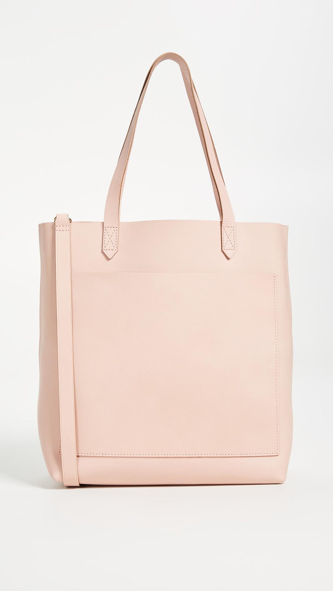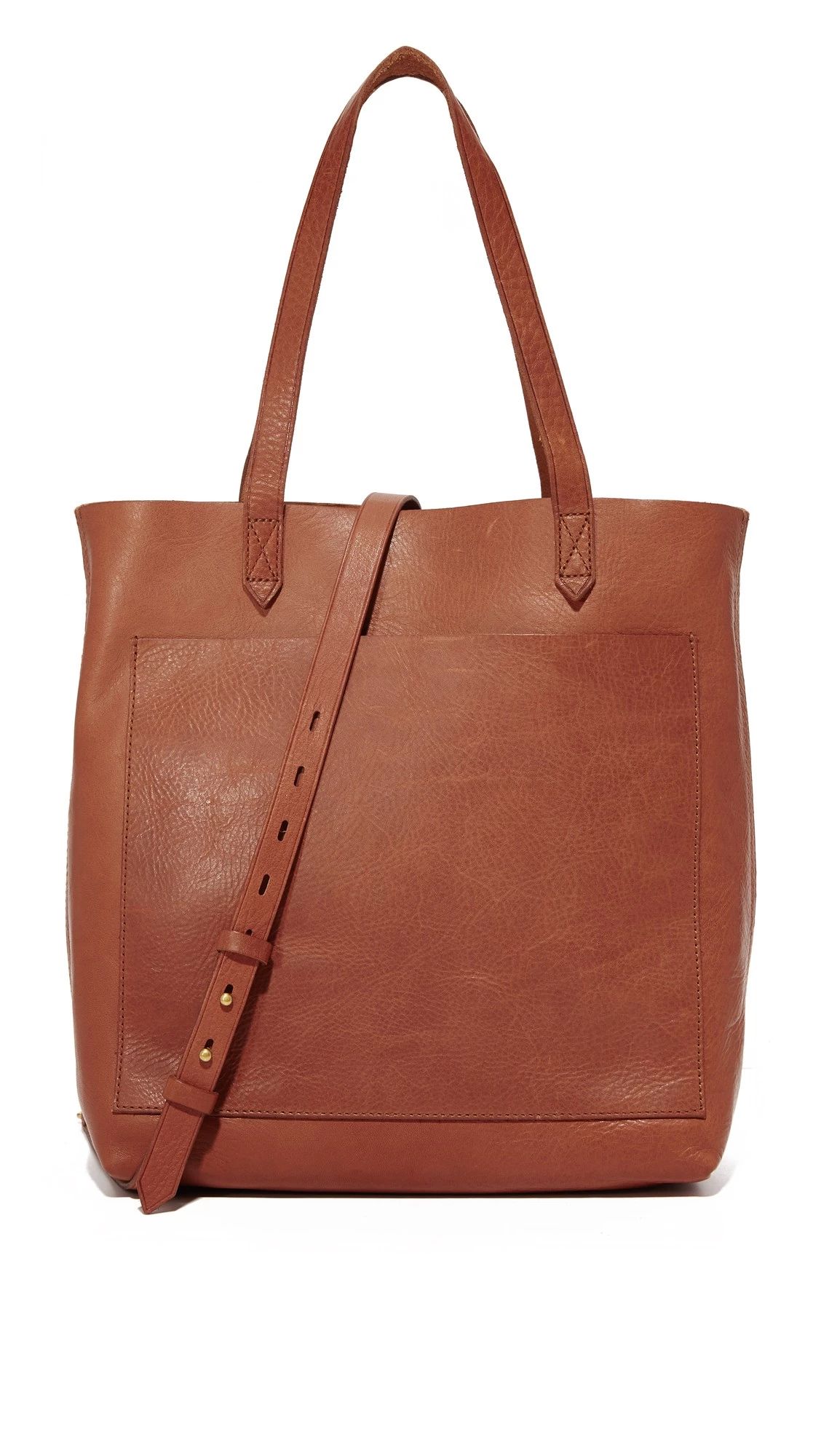這一類托特包通常包口比上一款略微狹窄一些,大部分可以單肩背,因?yàn)槠洫M長(zhǎng)的造型在視覺上搭配空間更大。madewell的totebag就是這一類包的典型代表: