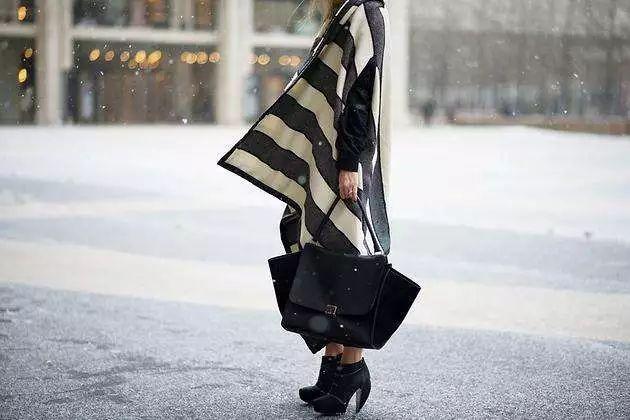 條紋披肩十分吸睛,這時(shí)候需要黑色手提包來(lái)中和一下。這波搭配想不拿滿分都不行!