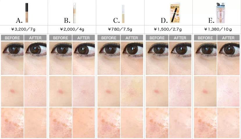 這一類呢都是屬于液體狀的遮瑕膏,很適合眼角、嘴角的表情紋,以及因睡眠不足、色素沉著引起的黑眼圈,嘴角以及鼻翼處。建議選擇比粉底亮一號的顏色,可打造無瑕肌?!羯唐吩斍椋ㄗ笃穑〢:NARS 這個也算是NARS的一個名品,延展性好且不易脫妝,同時配合天然保濕成分,打造自然明亮的肌膚。售價:3456日元。B:ettusais 這款屬于藥用的遮瑕膏哦,適合干燥肌,遮蓋痘印的同時還可有效防止青春痘的生成,共三色可選。售價2160日元。C:canmake 白菜價實力派商品,SPF25有效隔離紫外線,這小效果也出眾哦。售價842日元。D:DASODA 很適合化妝菜鳥的初心者,刷頭式涂抹很易上手,打造立體美顏。售價:1620日元。E:CandyDoll 兩色可選,防汗不易脫妝,配合Q3成分,瑕的同時有效保濕。售價:1490日元?!羰蹆r&遮瑕效果一覽