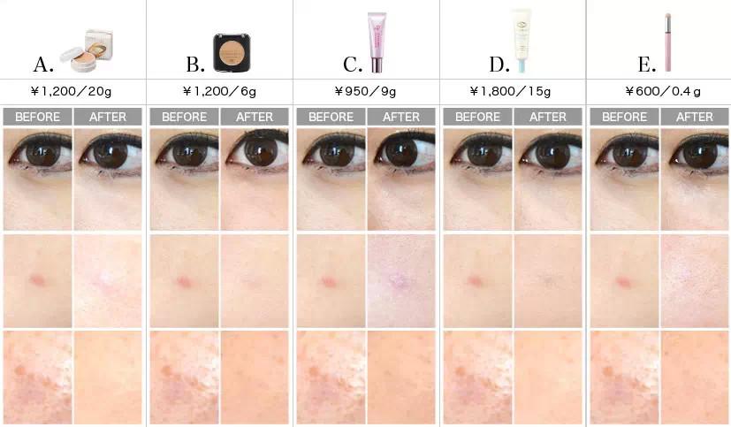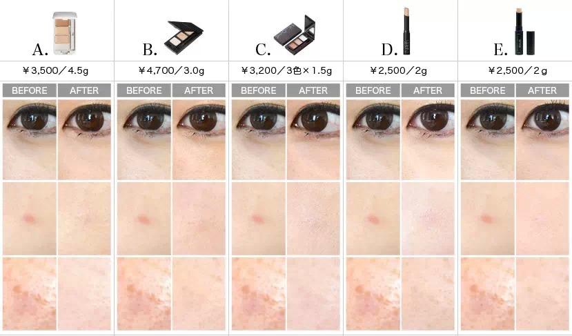 在挖掘好用的遮瑕膏式,用戶的評價也是不可忽視的,好用肯定是第一位,其次關(guān)心的相信就是便于收納了,這幾種也是用戶評價較高且方便攜帶的幾種哦。◆商品詳情(左起)A:資生堂 1980年出品,延續(xù)幾十年愛用,也屬于元老級的商品了。售價1296日元。B:CHACOTT 這個用上去會很自然,和粉底自然的融合為一體,售價:1296日元C:Za 保濕力和延展度都好的一款,售價:1026日元。D:P.N.Y.DIVISION 不脫妝、長時間持妝,可以有效遮蓋表情紋。共2色可選。售價1944日元。E:canmake 這款筆刷式的遮瑕膏也很好上手,可用刷頭進行暈染,呈現(xiàn)自然立體效果。售價:648日元?!羰蹆r&遮瑕效果一覽