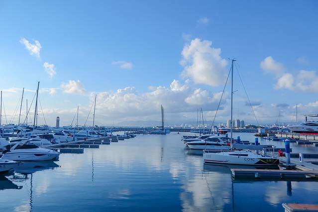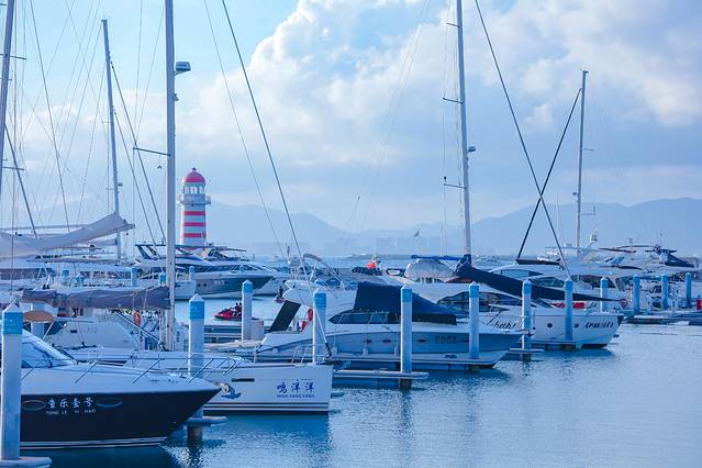 吉慶廣場(chǎng)的正對(duì)面就是帆船上港..藍(lán)藍(lán)的天空.蔚藍(lán)的大海,海面停著帆船和游艇;還有海南的椰子樹(shù)和大海讓你心曠神怡。