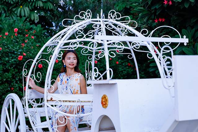 這里其實(shí)是婚紗攝影的取景地點(diǎn),我們是下午三點(diǎn)多到的,這里建筑會(huì)擋住太陽(yáng)不會(huì)覺(jué)得很曬。來(lái)到這邊除了有3、4對(duì)新人在拍婚紗照之外,其他人都是三三兩兩的,人不算多。是比較小眾而且人不算太多的網(wǎng)紅地方。里面有滿滿的歐洲風(fēng)情,整條街都是濃濃的歐式小鎮(zhèn)味道。有白色歐式大教堂、 紅色電話亭、白色老爺車、洋氣的小摩托、可愛(ài)的小火車、童話般的南瓜車、大相框、花花高跟鞋、超多拍照的好搭檔。
