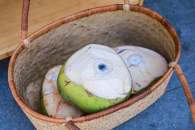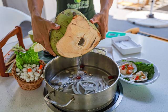 三個(gè)椰子一鍋湯,餐廳小哥現(xiàn)切椰子,三個(gè)滿滿的椰子水倒入鍋中,再來(lái)一瓶天涯故事,今日份的美食就開(kāi)始了