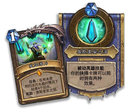 任務(wù)(Quest):和現(xiàn)有的任務(wù)牌一樣,這些法力值消耗為(1)點的傳說卡牌會出現(xiàn)在起始手牌中,使用后會在英雄頭像上方追蹤任務(wù)進度。完成任務(wù)即可獲得足以改寫局勢的全新英雄技能。