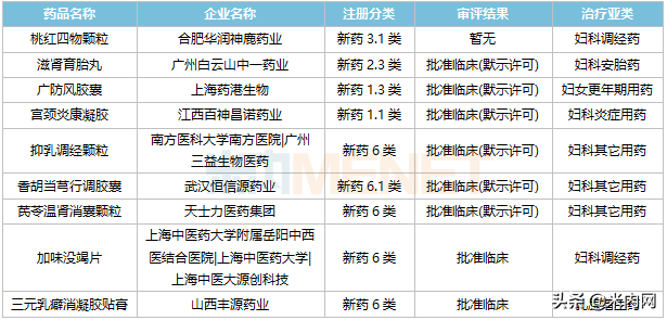 今年1月,華潤三九子公司合肥華潤神鹿藥業(yè)的桃紅四物顆粒以新藥3.1類提交上市申請在審評審批中,該產(chǎn)品是婦科調(diào)經(jīng)藥。此外,8個產(chǎn)品獲批臨床,包括天士力醫(yī)藥集團的芪苓溫腎消囊顆粒、江西百神昌諾藥業(yè)的宮頸炎康凝膠、武漢恒信源藥業(yè)的香胡當芎行調(diào)膠囊等,白云山中一藥業(yè)的滋腎育胎丸增加“卵巢儲備功能下降”適應癥。
