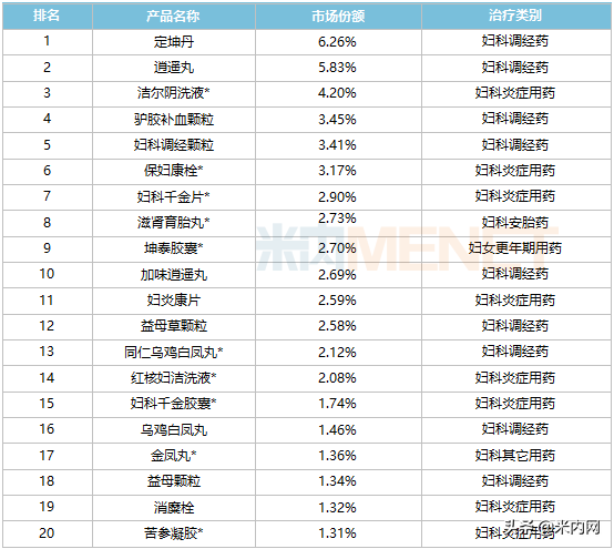 TOP20產(chǎn)品中,有10個產(chǎn)品,涉及株洲千金藥業(yè)、山東步長神州制藥、四川恩威制藥等7家企業(yè),其中,潔爾陰洗液、保婦康栓、婦科千金片等5個產(chǎn)品均在前十之列。