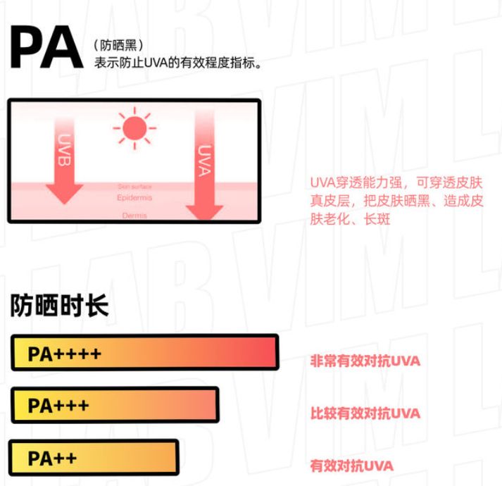 PA是指抗UVA的防護能力,主要反映延緩曬黑的防曬霜的等級,“+”號越多,防護 UVA能力越強。