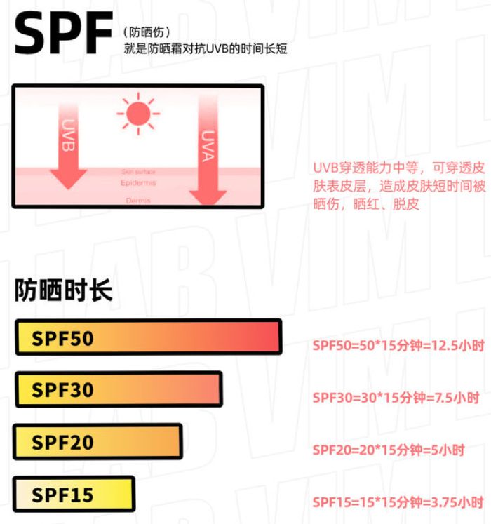 SPF指的是對UVB的防護能力,即日光防護系數(shù),用來評價防曬劑防治皮膚發(fā)生日曬紅斑的能力,數(shù)值越大,抵御的時間越長。