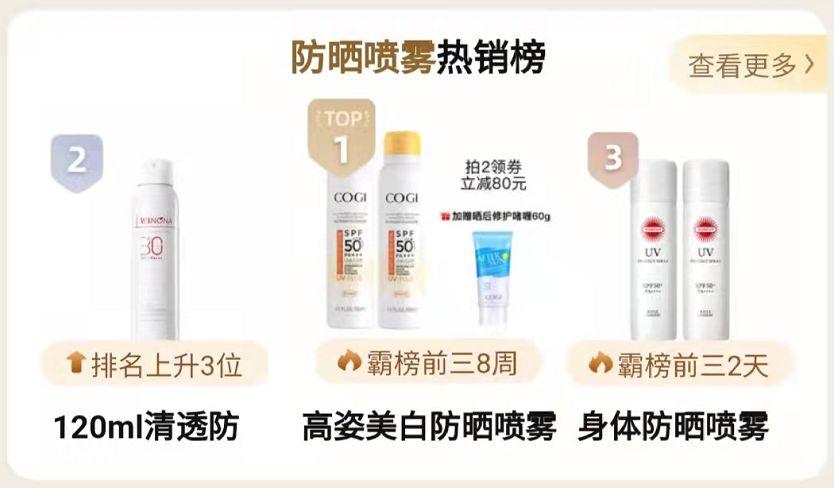 根據(jù)天貓榜單3月9日實時數(shù)據(jù)顯示,高姿美白防曬噴霧連續(xù)8周蟬聯(lián)防曬噴霧熱銷榜前三位置。
