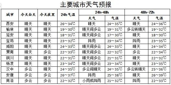 8月9日:全省多云間陰天,陜北有小到中雨,部分地方有大雨,局地有暴雨,關(guān)中、陜南部分地方有陣雨。關(guān)中南部部分、陜南東部部分地方有36-38℃的高溫天氣。