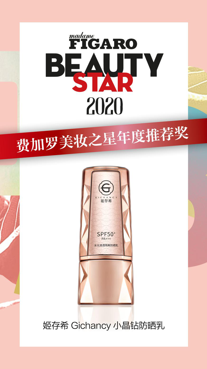 姬存希小晶鉆防曬乳獲2020“費(fèi)加羅美妝之星年度推薦獎(jiǎng)”