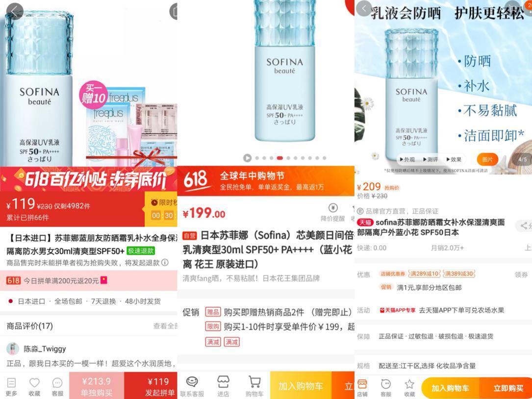 再比如夏天必備的蘇菲娜防曬霜,在“百億補貼”的助力下,只要119元。而京東上售價199元,天貓上則要209元。