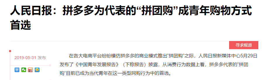 另有人民日報發(fā)布的《中國青年發(fā)展報告》調研顯示,以拼多多為代表的“拼團購”方式,已經成為青年購物方式,截止到2018年底,拼多多上16-25歲的年輕用戶占比就已經達40.6%。