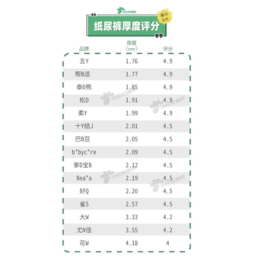 五Y、幫B適、泰D熊、松D、柔Y這5款紙尿褲較薄,厚度<2mm。