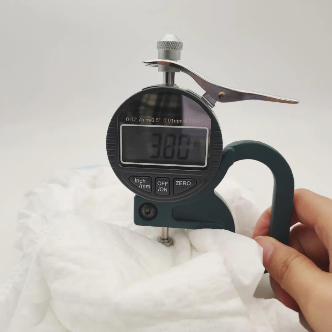 測(cè)試方法:利用測(cè)厚規(guī)多次測(cè)量紙尿褲中心部位厚度,后取平均值即為該款紙尿褲的中心厚度。
