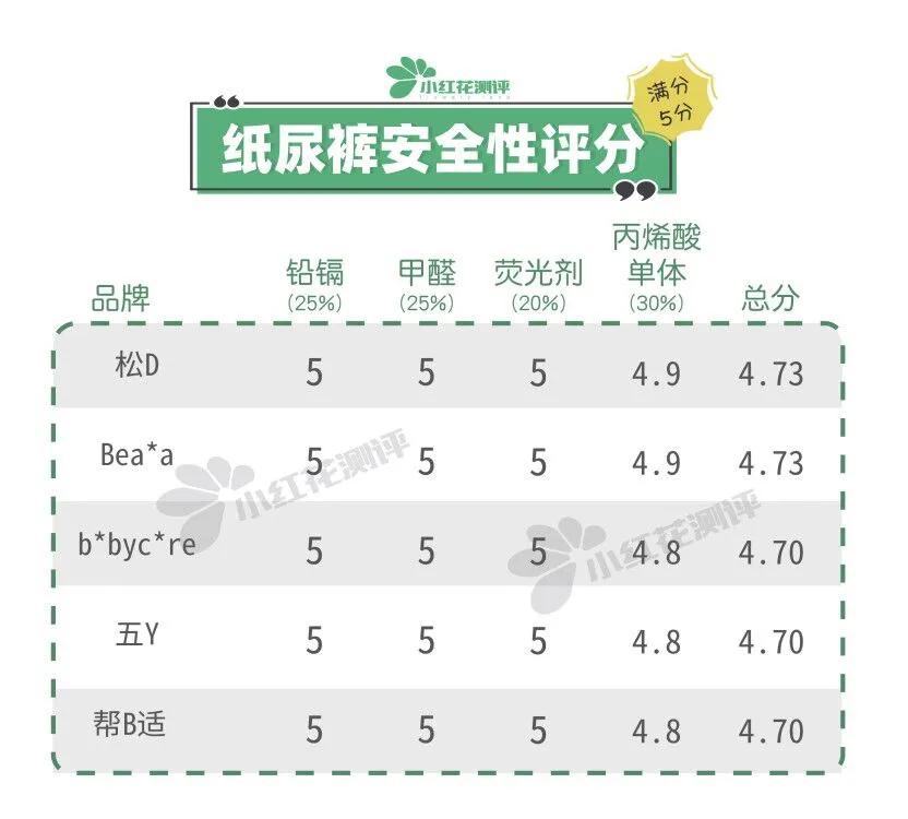 性檢測(cè)花爸為嚴(yán)格要求,對(duì)排名前5的紙尿褲進(jìn)行了重金屬鉛鎘、游離甲醛、熒光增白劑和丙烯酸單體的檢測(cè)。